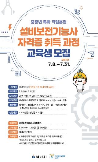 하남일자리센터는 종합기술전문학교인 한국폴리텍대학 성남캠퍼스와 협업으로 중장년 하남시민을 위한 기술 전문 직업훈련과정인‘설비보전기능사 자격증 취득 과정’을 신규로 운영한다고 9일 밝혔다.