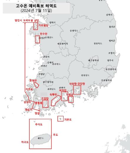 국립수산과학원이 서·남해 제주 연안의 21개 해역에 대하여 고수온 예비특보를 발표(7.11, 14시부)함에 따른 조치이다. 해당 해역은 다음 주 장마전선 북상 후 수온 상승이 예상되는 상황이다.