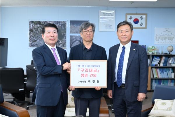 백경현 구리시장은 7월 11일 신동화 구리시의회 의장과 함께 조우석 국토지리정보원장을 만나 세종~포천 고속도로상 33번째 한강횡단교량의 명칭을 반드시 ‘구리대교’로 명명해야 하는 당위성에 대해 적극 설명했다.
