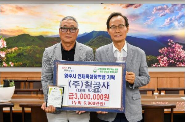 (재)영주시인재육성장학회는 지난 11일 ㈜칠공사(대표 박재훈)에서 지역인재 육성을 위한 소중한 마음을 담아 인재육성장학금 3백만 원을 기탁했다고 밝혔다.