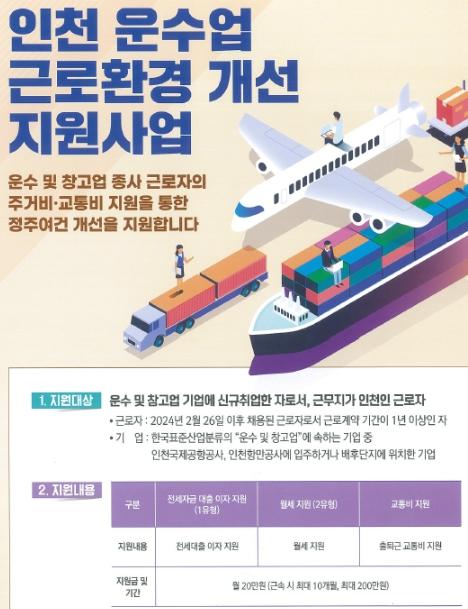 ‘근로환경 개선 지원사업’은 인천지역 운수·창고 근로자를 대상으로 출퇴근 교통비, 주거비(전세대출 이자 지원, 월세 지원)를 월 20만 원씩 최대 200만 원(10개월 근속 기준)까지 지원하는 사업이다. 올해 총 70명을 지원할 방침이다.
