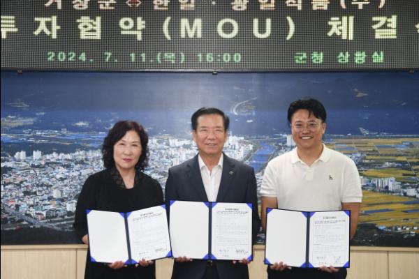 거창군은 11일 군청 상황실에서 구인모 군수, 백종길 한일 대표, 손유자 농업회사법인광일식품(주)대표와 관계자가 참석한 가운데 두 기업과 투자협약을 체결했다.