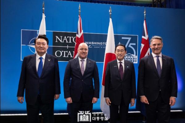 각국 정상들은 가치를 공유하는 한국, 일본, 호주, 뉴질랜드 4개국이 긴밀하게 공조해 오고 있음을 평가하고, 우크라이나와 북한 문제 등 국제 안보 도전에 대한 공동 인식과 연대 의지를 확인했다. 정상 회동에서 대통령은 불운했던 전쟁의 역사를 되풀이하지 않으려면 강력하고 압도적인 억제력과 함께 규범 기반 국제질서를 지켜나가고자 하는 국가들 간의 ‘협력의 힘’이 필요하다고 강조했다.