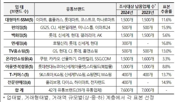 공정거래위원회는 9개 업태 42개 유통브랜드와 거래하는 7,600개 납품·입점업체들을 대상으로 ①행위 유형별 불공정 거래행위 경험, ②거래관행 개선 체감도, ③표준계약서 활용 현황, ④신규 제도개선 사항 인지도 등을 파악하기 위해 2024년 유통분야 서면실태조사를 실시한다.
