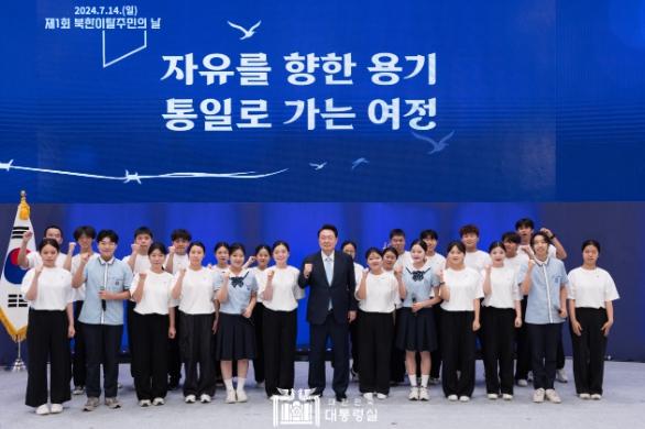 윤석열 대통령은 오늘(7. 14, 일) 오전 청와대 영빈관에서 개최된 ‘제1회 북한이탈주민의 날 기념식’에 참석했다. ‘북한이탈주민의 날’은 대통령이 지난 1월 16일 국무회의에서 북한이탈주민을 따뜻하게 포용하고 성공적인 정착을 격려하기 위해 제정을 약속한 것으로, 북한이탈주민의 날 기념식을 개최한 것은 역대 정부 중 이번이 처음이다.