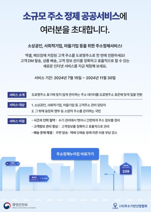 이에, 행정안전부는 주소정제 공공 서비스를 무료로 제공하여 소상공인의 불편을 해소하고, 표준 주소 사용을 널리 알릴 계획이다.