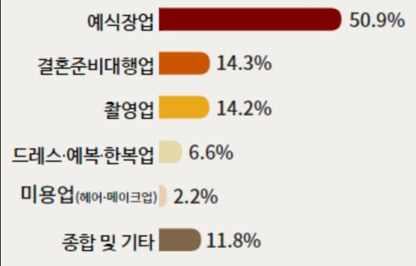 민원유형별로 보면 업계별로는 예식장업(514건) ?결혼 준비 대행업(144건) ?촬영업(143건) ?드레스·예복·한복업(67건) ?미용업(22건) 순이며, 소비자 불편 및 피해 내용별로는 ?계약해제(397건) ?계약불이행(293건) ?비용(176건) 순이다.
