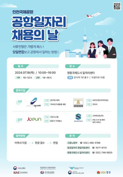 이번 ‘공항 일자리 채용의 날’은 항공산업 분야 일자리 확대와 관련 기업의 인력수급 문제 해결을 위해 마련된 행사로, 인천 중구와 중부지방고용노동청, 항공일자리 취업지원센터가 협업해 운영한다.