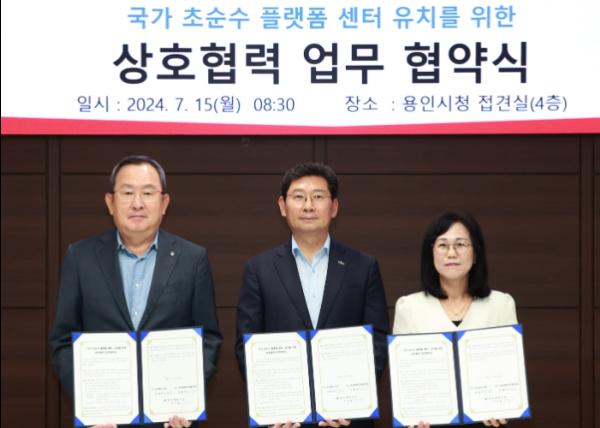 용인특례시는 15일 반도체 생산에 필수 물질인 초순수를 연구할 ‘국가 초순수 플랫폼센터’를 유치하기 위해 명지대학교, 경기환경에너지진흥원과 공동 대응을 위한 상호협력 업무협약을 체결했다고 밝혔다.