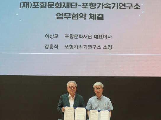 (재)포항문화재단은 16일 체인지업그라운드에서 포항가속기연구소, 한국문화예술위원회와 첨단 과학기술과 예술이 결합한 융합예술 분야의 창작과 활용 및 확산을 위한 업무협약을 체결했다.