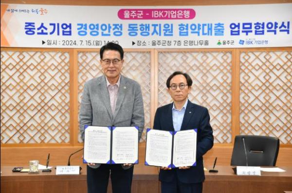 울산시 울주군이 IBK기업은행과 15일 군청 은행나무홀에서 중소기업 경영안정 동행지원 협약대출 업무협약을 체결했다.