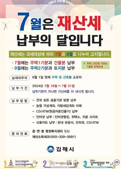 김호영 재산소득세과장은 “매년 정기적으로 부과되는 재산세는 우리 시의 소중한 재원으로, 행복한 도시 김해를 만들기 위해 납세자 분들의 성실한 납부”를 당부했다.
