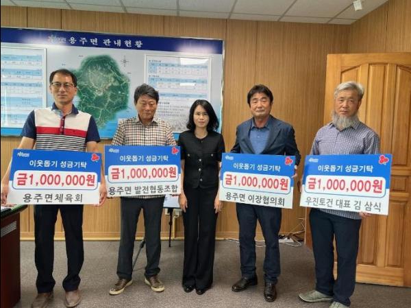 지난 15일에는 초등학교, 중학교 동기회에서 십시일반 자발적으로 모은 성금1,300만원을 전달하고, 이어 용주면 체육회(회장 김삼식), 발전협동조합(위원장 이호출), 이장협의회(회장 윤부한) 및 우진토건(대표 김삼식)은 16일 용주면사무소를 방문해 주택붕괴 가구에 전달해 달라며 각각 100만원씩, 총 400만원을 기탁했다.