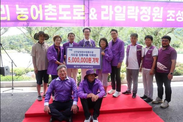 신안군정원수사회적협동조합 지도읍 장동마을 작목반 임원과 회원들은 지난 15일 지도 장동에서 봉리 농어촌 도로·라일락 정원 준공식에서 (재)신안군장학재단에 장학기금 500만 원을 전달했다.