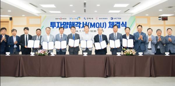 구미시는 17일 시청에서 한화시스템 협력업체인 ㈜신보, ㈜제노코, 알에프코어㈜, ㈜빅텍 4개사와 사무실 개소 및 생산?연구개발 설비 구축을 위한 투자액 85억 원, 고용창출 33명 규모의 합동 투자양해각서(MOU)를 체결했다.