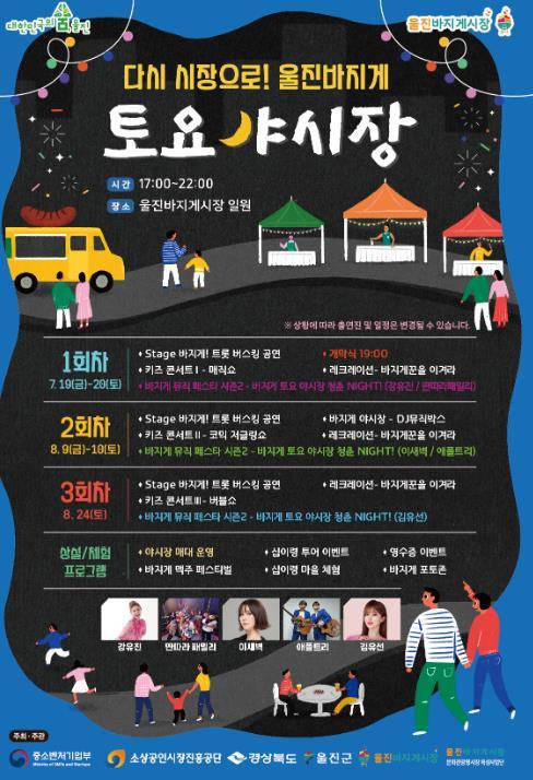 울진군은 오는 19일 울진바지게시장에서 작년에 이어 두 번째로 ‘다시 시장으로! 바지게 토요 야시장’행사를 개최한다.
