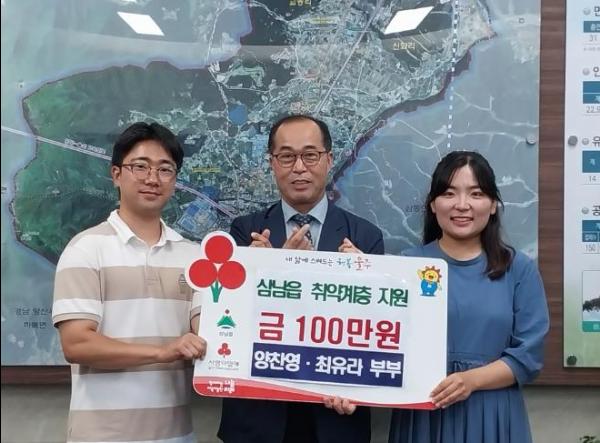 울주군 삼남읍 주민 양찬영·최유라 부부가 17일 삼남읍 행정복지센터에 지역 저소득층 이웃을 돕기 위한 성금 100만원을 기탁했다.