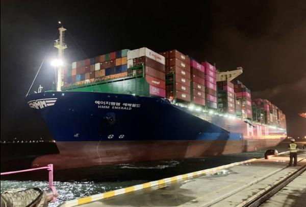 17일 인천 신항 선광컨테이너터미널(SNCT)에 입항한 1만 3천788TEU급 선박 ‘에이치엠엠 에메랄드(HMM EMERALD)’호를 시작으로, 1만 3천TEU급 선박으로 개편된 ?HMM RUBY ?HMM PEARL ?HMM SAPPHIRE ?HMM TOPAZ ?HMM OPAL ?HMM TURQUOISE가 순차적으로 주 1회 인천항을 기항할 예정이다.