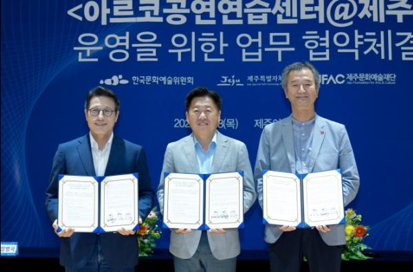 18일 오후 (가칭)제주아트플랫폼 3층에 마련된 ‘아르코공연연습센터@제주’에서 세 기관은 제주 공연예술 연습공간 조성 및 운영 활성화를 위한 3자 상호 업무 협력 공동협약을 체결했다.