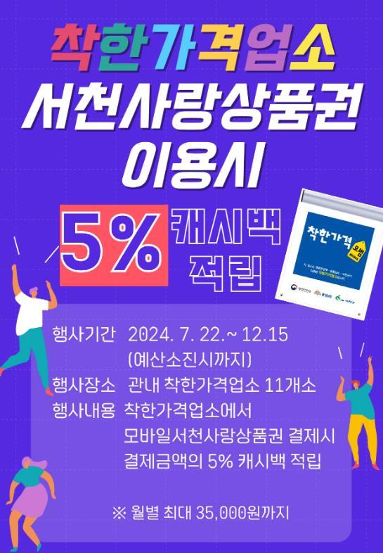 오는 22일부터 서천군 소재‘착한가격 업소’11곳에서 모바일 서천사랑상품권으로 결제하면 결제금액의 5%를 당일 돌려받는다.