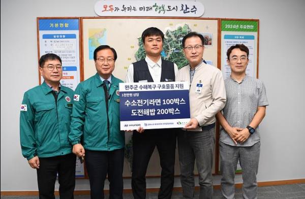 현대자동차 전주공장 노사가 집중호우로 큰 피해를 입은 완주군 지역 수재민들을 돕기 위해 1,000만 원 상당의 구호물품을 지원했다.