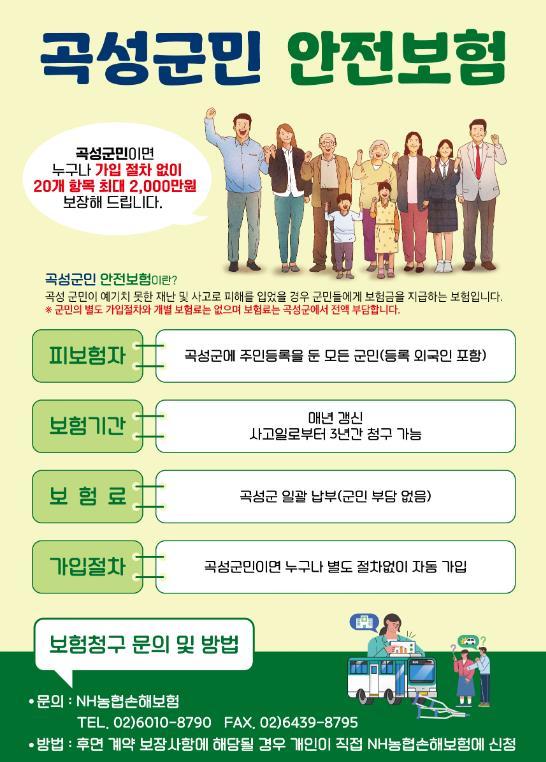 곡성군은‘곡성군민 안전보험’시행으로 곡성 군민이 예기치 못한 재난과 사고로 피해를 입었을 경우 군민들에게 보험금을 지급하고 있다.
