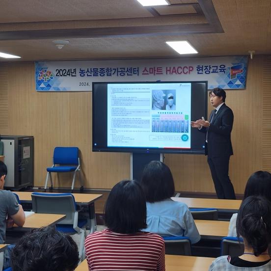 충남도 농업기술원은 19일 한국식품관리인증원과 협력해 기술원 내 교육관 및 현장에서 9개 시군 농산물종합가공센터 운영 담당자를 대상으로 ‘농산물종합가공센터 스마트 해썹(HACCP, 식품안전관리인증) 현장 교육’을 실시했다.