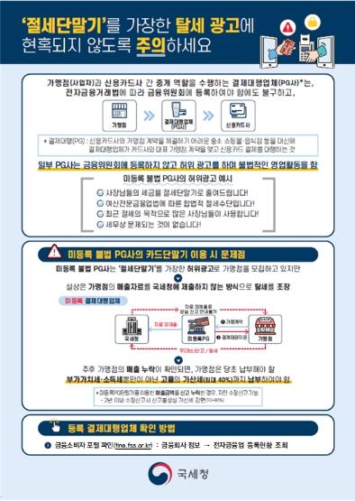 아울러, 국세청은 금융감독원과 미등록 혐의 결제대행업체 정보 공유, 실무협의 등 긴밀한 공조체제를 유지하면서 불법행위에 공동 대처하고 있다.