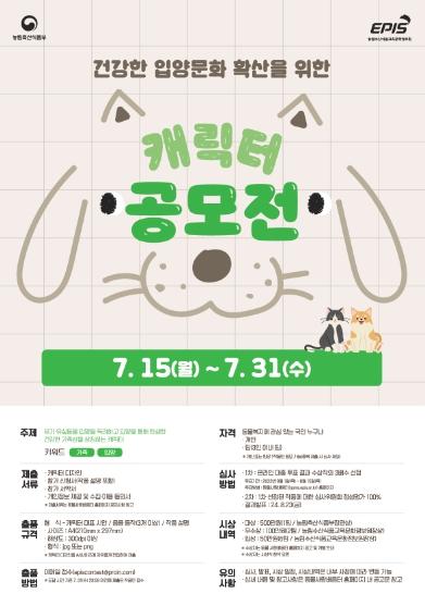 농림축산식품부는 유기·유실 동물에 대한 인식개선 및 입양 활성화를 위한 ‘캐릭터 공모전’을 7월 31일까지 개최한다.