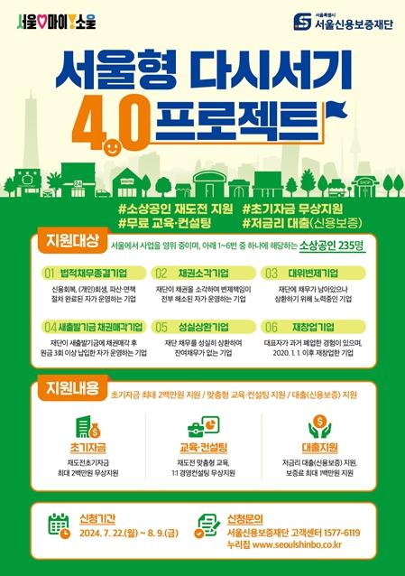 이번 서울형 다시서기 4.0프로젝트 지원대상은 실패 경험이 있으나 재도전 의지가 높은 서울시 소상공인들이며 재기 의지와 도전계획을 종합적으로 평가해 최종 대상을 선정한다. 예를 들면 폐업 경험이 있는 ‘재창업 기업’, ‘성실 상환기업’, 전액 변제는 못 했지만 법률 등이 정한 채무상환 책임을 다한 일명 ‘성실 실패기업’ 등이 대상이다.