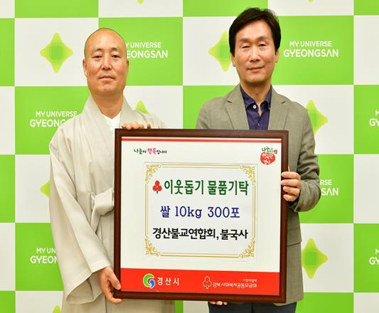경산불교연합회에서 22일 경산시청을 방문하여 어려운 이웃을 위해 사용해 달라며 쌀300포(10kg)를 기탁했다.