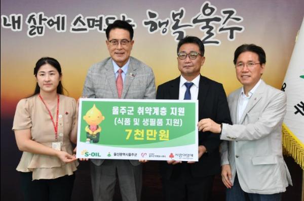 S-OIL이 22일 울주군청 군수실에서 이순걸 군수, S-OIL 김태기 본부장, (사)울주군자원봉사센터 손덕현 이사장, 사회복지공동모금회 울산지회 양호영 사무처장 등 관계자들이 참석한 가운데 성금 7천만원을 전달했다.