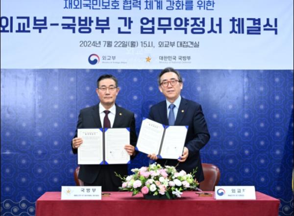 외교부와 국방부는 7월 22일 오후 외교부 청사에서 '재외국민 보호 협력체계 강화를 위한 외교부·국방부 간 업무약정' 체결식을 개최했다.