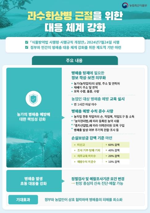 이번에 개정되는 주요 내용은 첫째, 국가 또는 지방자치단체장이 식물재배자 및 농작업자에게 과수원 출입, 예방약제 살포, 묘목 구매 내역 등 병해충 방제 관련 정보 제공을 요청할 수 있는 법적 근거를 마련하고, 정보를 거짓으로 작성하거나 작성·보존하지 않은 경우 과태료를 최대 300만원까지 부과하도록 했다.