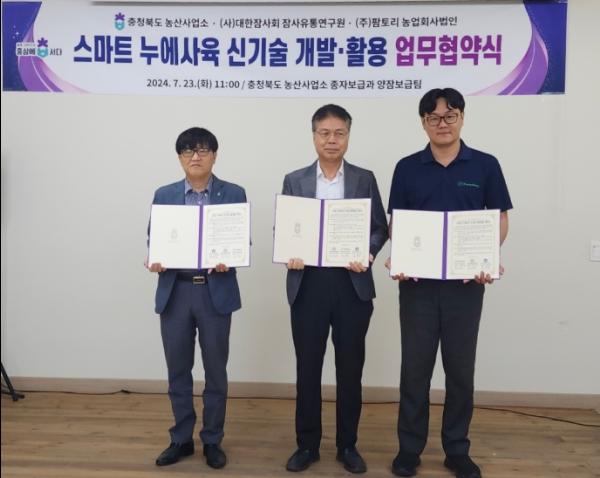 충북도는 23일 농산사업소에서 양잠업의 어려움을 타개하고 기존의 관행을 벗어난 새로운 누에사육 방식 개발을 위하여 잠업진흥단체, 스마트팜 농업회사법인과 업무협약을 체결했다.