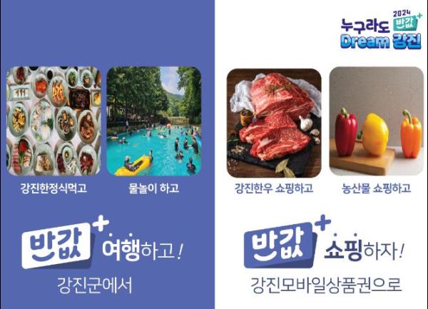 강진군은 여름 휴가철을 맞아 ‘누구라도 반값+ 강진여행’을 하고 반값으로 받은 모바일 상품권을 통해 우수한 강진 농수특산물을 반값으로 만나볼 수 있게 됐다고 24일 밝혔다.