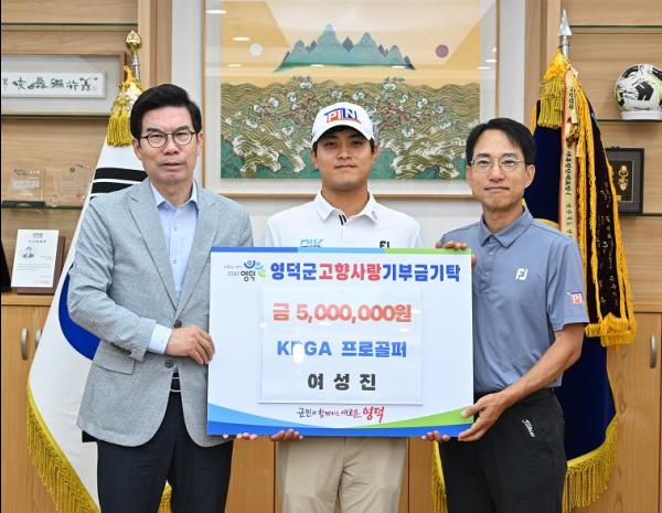 KPGA에서 활약 중인 여성진 프로골퍼가 지난 22일 부친 ㈜피아이케이 여승호 대표와 함께 영덕군청에서 김광열 영덕군수를 만나 고향사랑 기부금 500만 원을 전달했다.