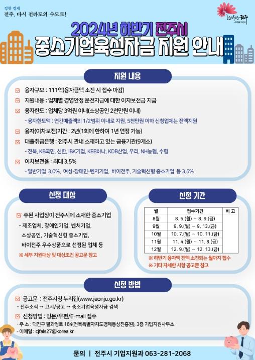 전주시는 중소기업과 소상공인의 경영 안정을 돕기 위해 올 하반기 약 111억 원 규모의 중소기업육성자금을 지원할 계획이라고 24일 밝혔다.
