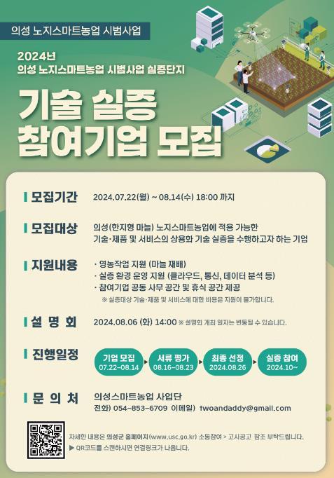 신청 자격은 노지 스마트농업에 적용이 가능한 기술·제품 및 서비스를 보유한 기업으로, 의성 노지 스마트농업 대상 작물인 마늘 생육 관리에 적용할 수 있는 기술이어야 한다.