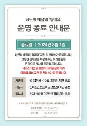 남원시가 지역 소상공인의 배달 앱 수수료 부담을 덜어주기 위해 도입했던 배달 앱 '월매요'의 운영을 8월 1일부터 종료한다고 밝혔다.