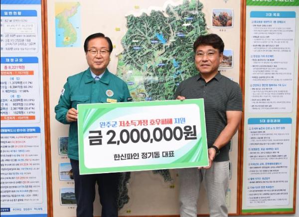 완주군 운주면에 위치한 ㈜한신파인이 집중호우로 큰 피해를 입은 완주군에 성금 200만 원을 기탁했다.
