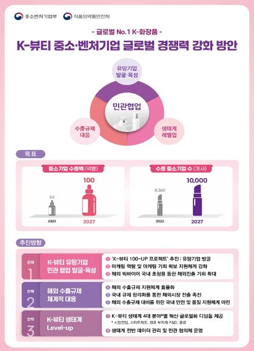 첫째, 민간의 우수한 전문성과 인프라를 활용하여 K-뷰티 글로벌화 유망기업을 발굴?육성한다. CJ 올리브영, 아마존, 콜마, 코스맥스 등 민간 플랫폼 및 제조?유통사와 협업하여 수출 유망기업을 발굴하고, 선정기업에게는 민간 협업기관들이 자사의 유통망 및 전문성 등을 활용하여 마케팅과 수출 전략 컨설팅을 지원하고, 식약처와 중기부는 수출 지원 정책 등을 연계 지원한다. 또한, 콜마와 모태펀드가 공동으로 해외 진출 화장품 제조기업 등에 중점 투자하는 “K-뷰티 전용펀드”도 최초로 조성할 계획이다.