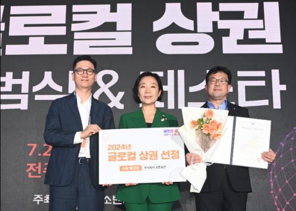 중소벤처기업부 주관 ‘2024년 글로컬 상권 창출팀’ 공모에 선정된 수원시가 24일 전주 문화공판장 작당에서 열린 ‘글로컬 상권 출범식’에서 글로컬 상권 창출팀 선정서를 받았다.