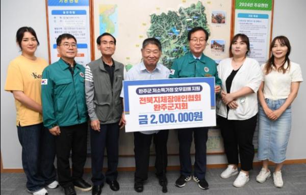 전북지체장애인협회 완주군지회가 완주군 집중호우 피해 주민들을 위해 써달라며 성금 200만 원을 기탁했다.