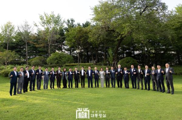 본격적인 만찬에 앞서 대통령과 참석자들은 파인그라스 잔디마당에서 당정 결속을 다지는 의미로 다함께 손을 맞잡고 사진을 찍고, “국민의힘 화이팅”을 외치며 또 한번 촬영을 했다.