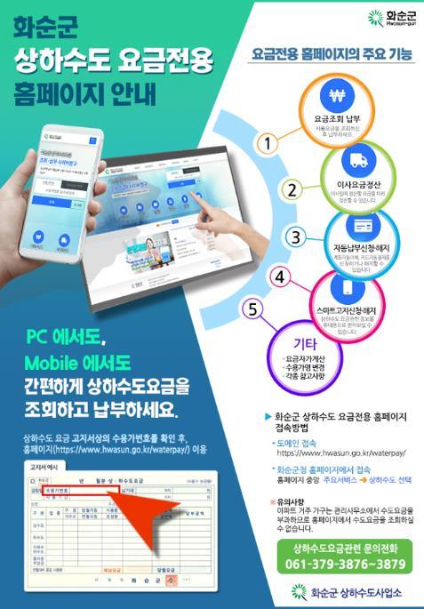 화순군은 25일 군민들의 상하수도요금 납부 편의를 위해 올해 7월 24일부터 상하수도 요금 전용 홈페이지인 ‘상하수도 요금조회 납부 사이버 창구’를 개설하고 운영에 들어갔다고 밝혔다.