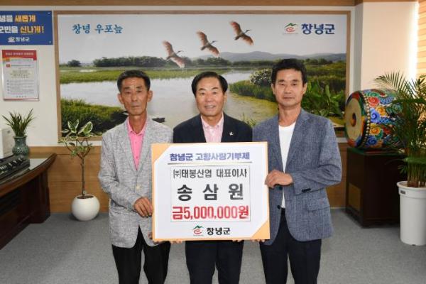창녕군은 지난 23일 ㈜태봉산업 송삼원 대표가 창녕군에 고향사랑기부금 연간 최대 기부 금액인 5백만 원을 기탁했다고 밝혔다.