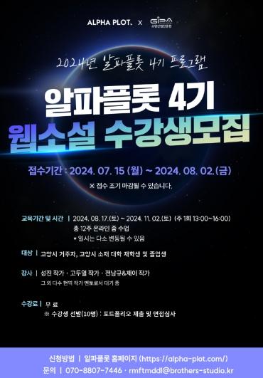 접수 기간은 8월 2일까지이며, 알파플롯 누리집을 통해 신청받는다. 2차 아카데미에서는 웹소설 작가 데뷔에 관심 있는 만 19세 이상 고양시민, 고양시 소재 대학교 재학생 및 졸업생을 포함해 10명을 모집한다. 교육생은 서류심사와 면접심사를 거쳐 선발한다.