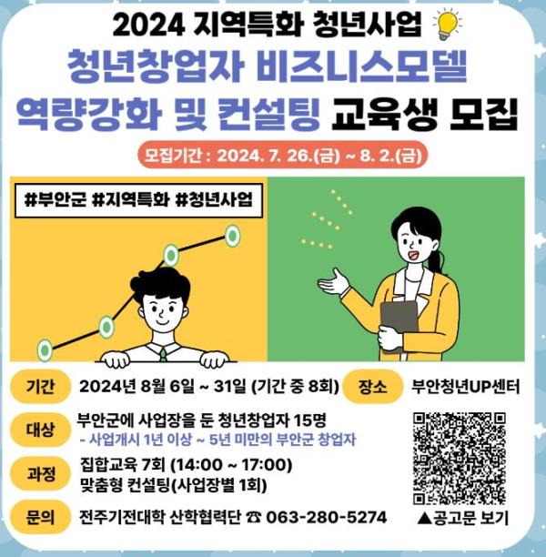 부안군은 지역특화 청년사업(청년날다Ⅱ) 청년창업자 비즈니스모델 역량강화 교육 및 컨설팅 참여자를 모집한다고 밝혔다.