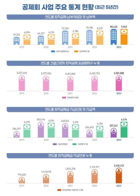먼저, 퇴직공제사업의 주요 성과로는, 2023년도 퇴직공제 가입 공사는 86,492곳으로 전년 대비 12.1% 증가했고, 1998년부터 2023년까지 퇴직공제 적립 일수가 1일 이상인 근로자는 총 550만 명이며, 이중 작년도에는 173만 명으로 전년 대비 5.2% 증가했다. 한편, 건설업을 퇴직하여 퇴직공제금을 지급받은 근로자는 31만 명(20.7%↑), 지급액은 6,476억 원(36.0%↑)이고, 1인당 평균 지급액은 211만 원(12.7%↑)으로 나타났다.